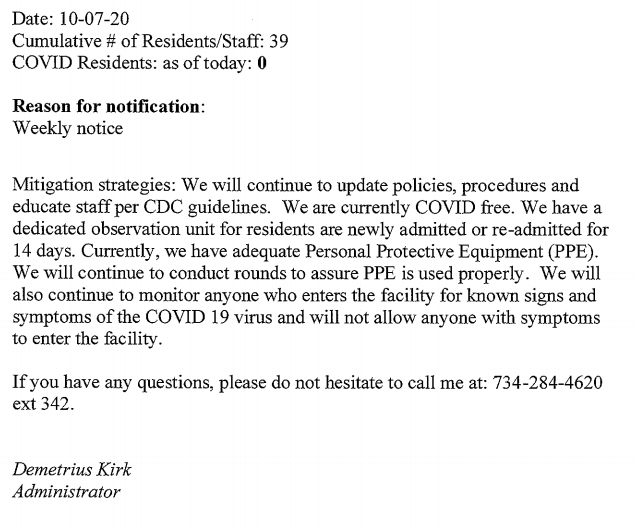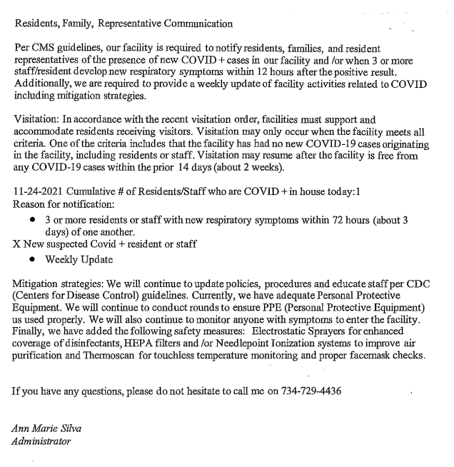 Mitigation strategies: We will continue to update policies, procedures and educate staff per CDC guidelines. We have a dedicated isolation unit for residents who show symptoms of COVID-19 or those that are admitted with or test positive for COVID-19. At this time, we have adequate Personal Protective Equipment (PPE). We will continue to conduct rounds to assure PPE is used properly and we will continue to follow the “No Visitor” Executive Order guidelines. We will also continue to monitor anyone who enters the facility for known signs and symptoms of the COVID 19 virus and will not allow anyone with symptoms to enter the facility. If you have any questions, please do not hesitate to call me at: 734-309-3269. Ann Marie Silva Administrator