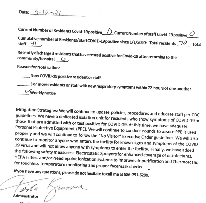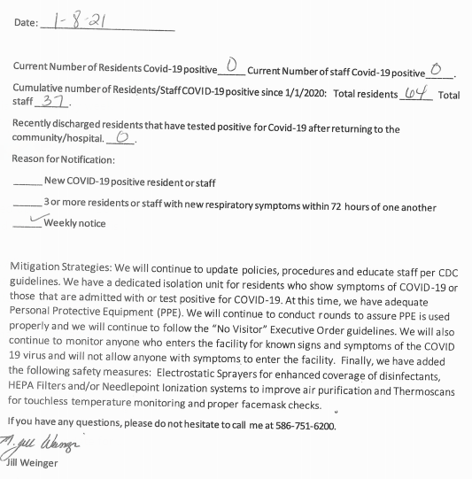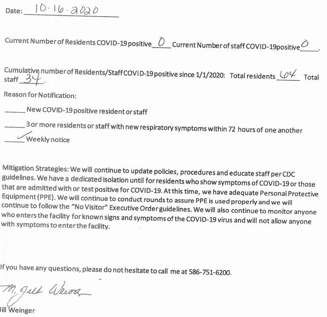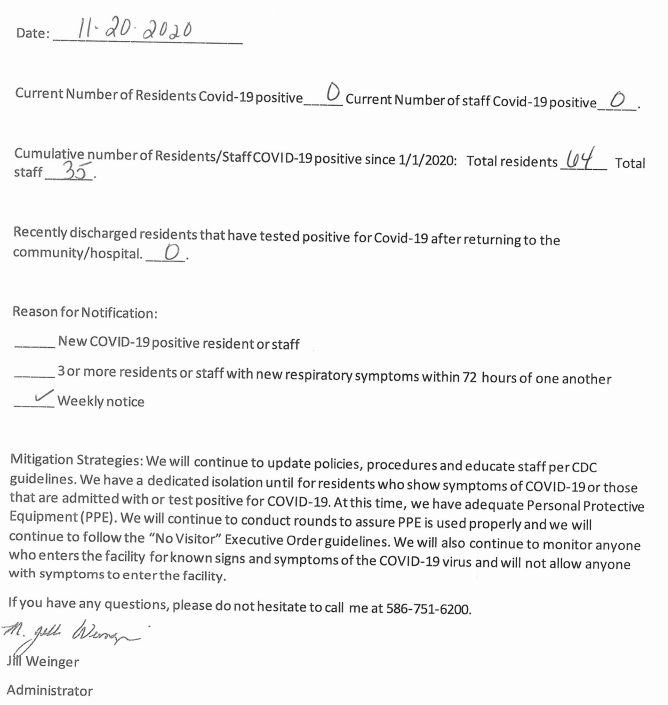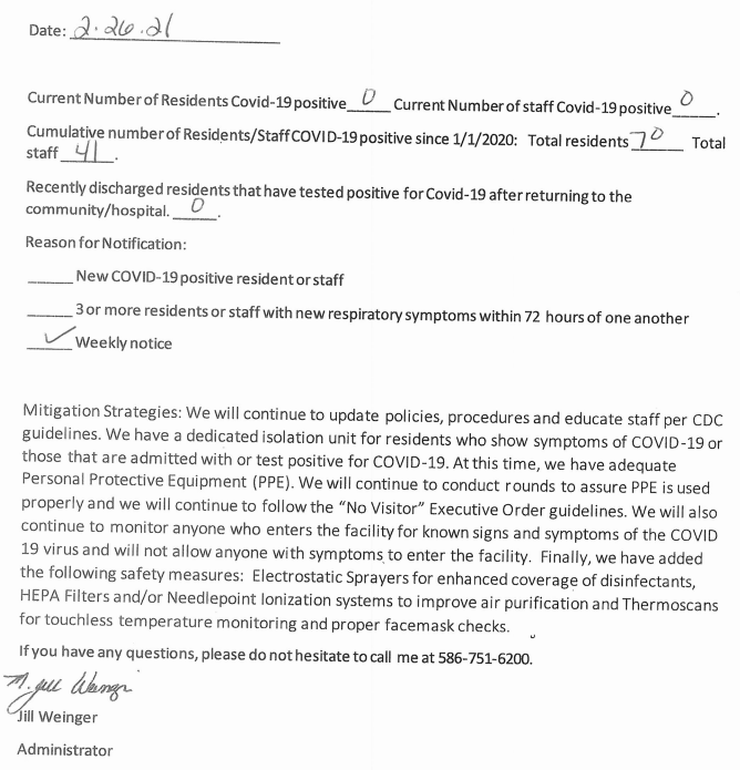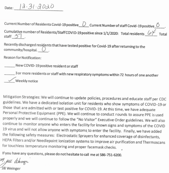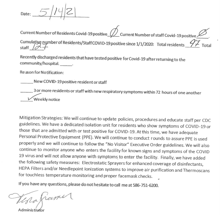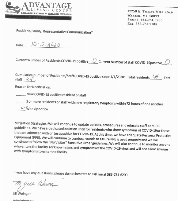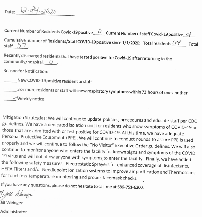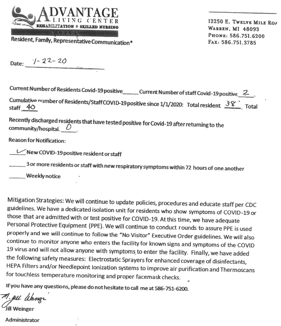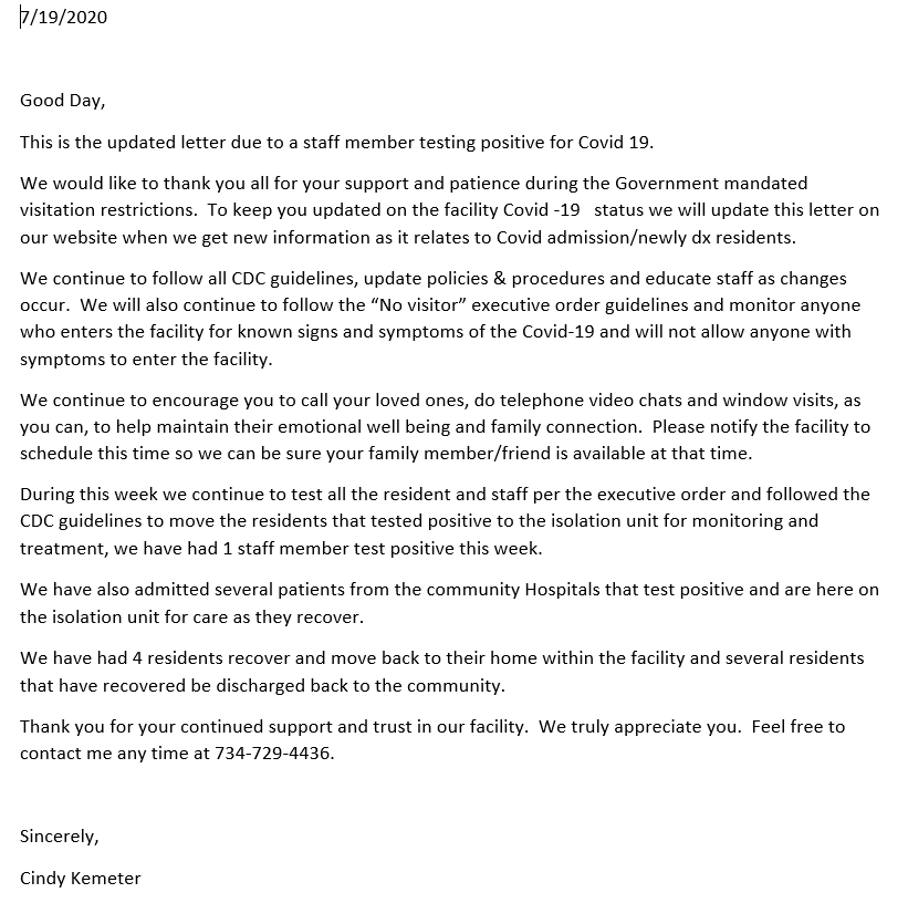 We will continue to update policies, procedures and educate staff per CDC guidelines. We have a dedicated isolation unit for residents who show symptoms of COVID-19 or those that are admitted with or test positive for COVID-19. At this time, we have adequate Personal Protective Equipment (PPE). We will continue to conduct rounds to assure PPE is used properly and we will continue to follow the “No Visitor” Executive Order guidelines. We will also continue to monitor anyone who enters the facility for known signs and symptoms of the COVID 19 virus and will not allow anyone with symptoms to enter the facility. Finally, we have added the following safety measures: Electrostatic Sprayers for enhanced coverage of disinfectants, HEPA Filters and/or Needlepoint Ionization systems to improve air purification and Thermoscans for touchless temperature monitoring and proper facemask checks.