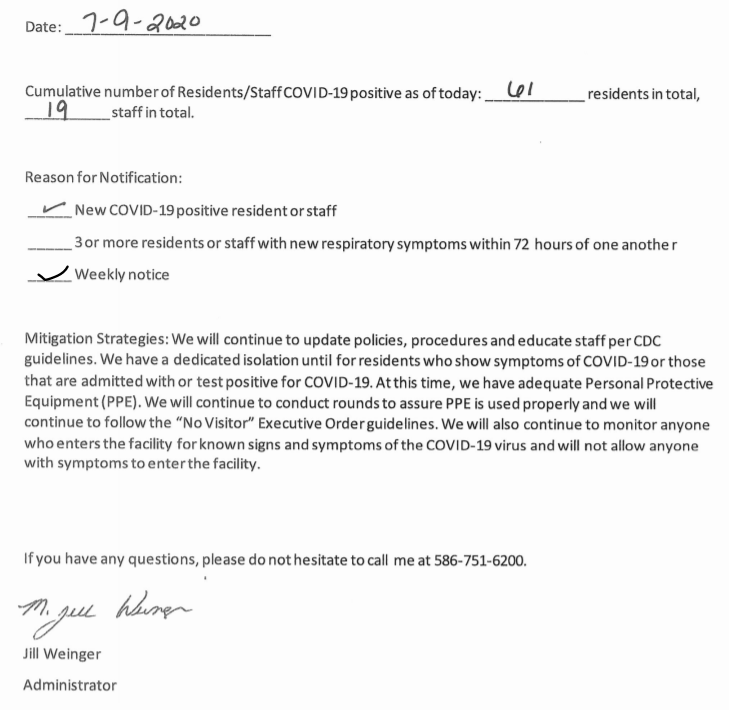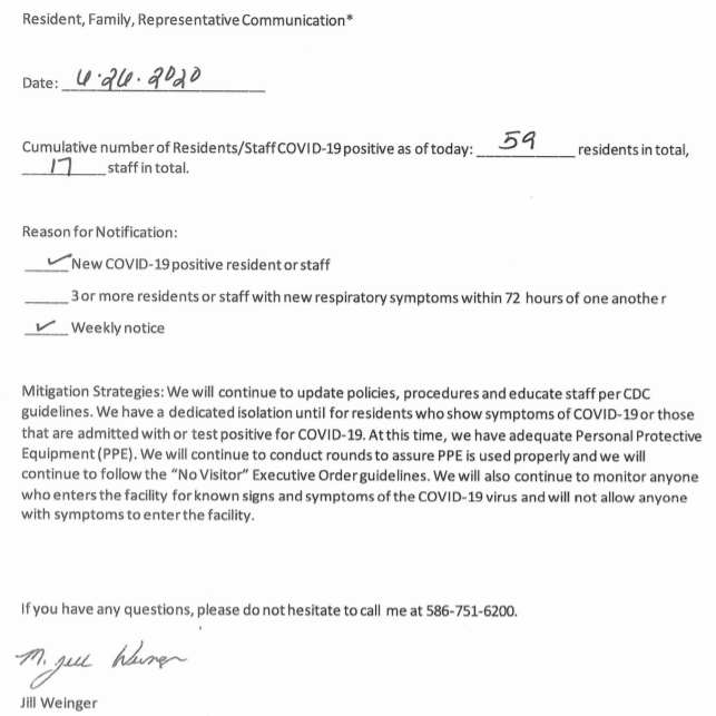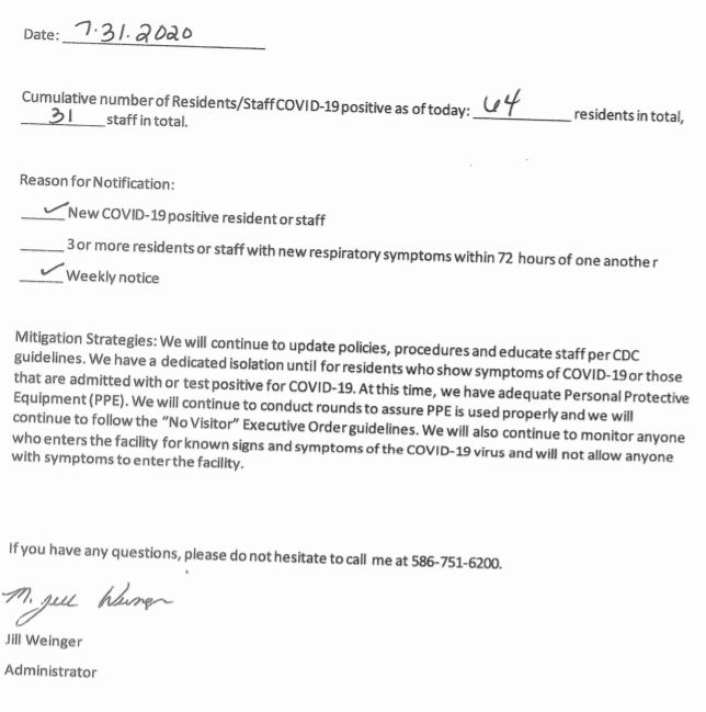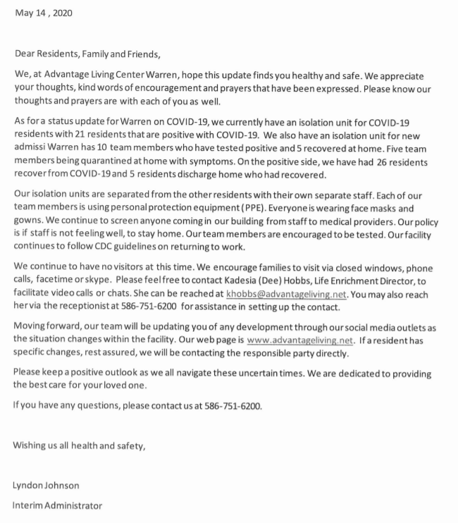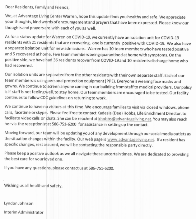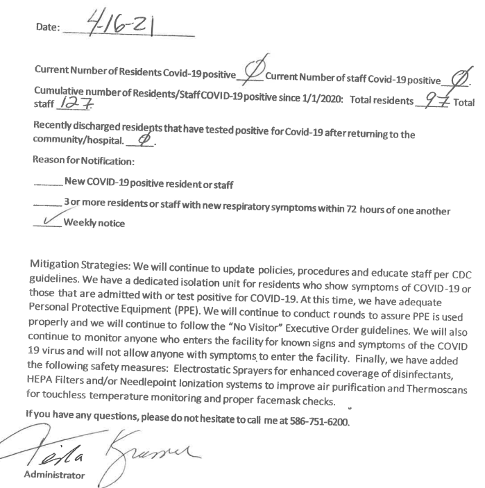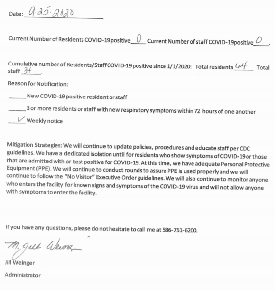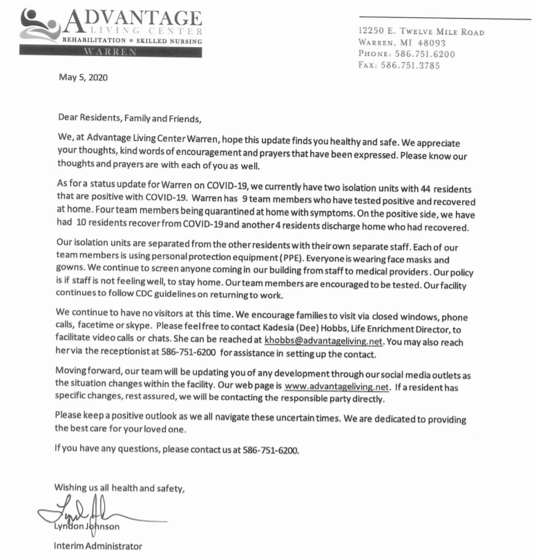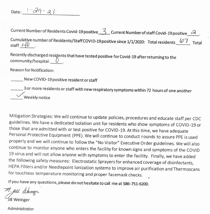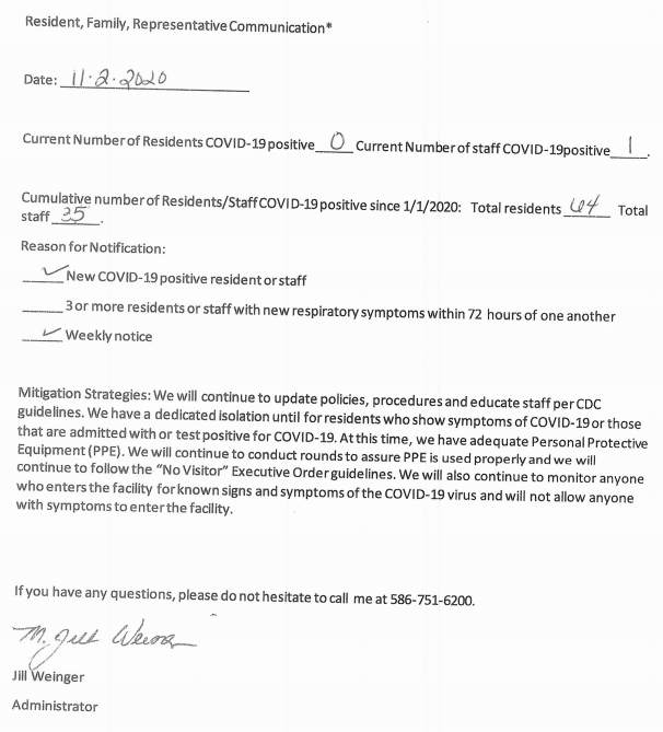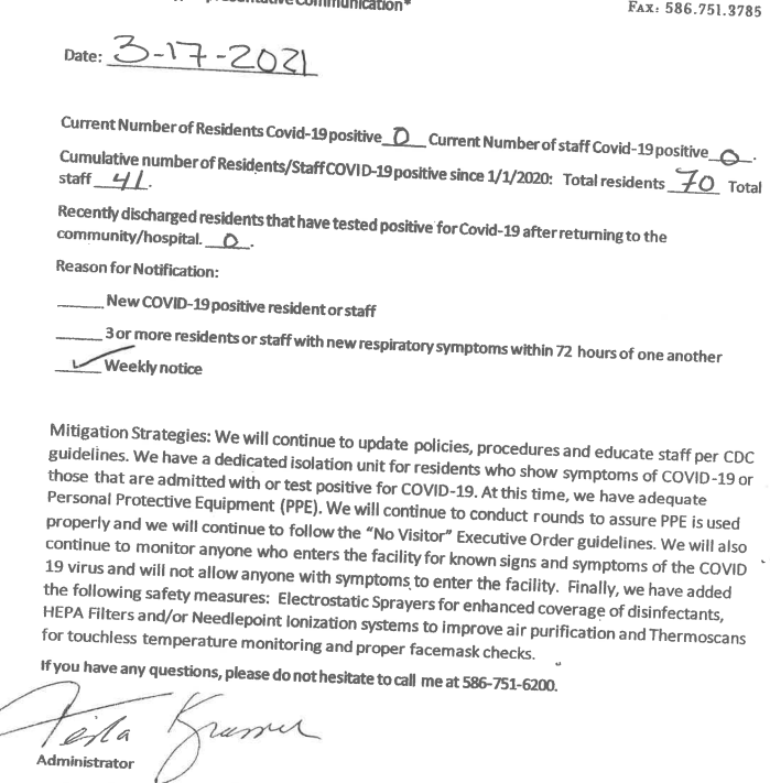 We will continue to update policies, procedures and educate staff per CDC guidelines. We have a dedicated isolation unit for residents who show symptoms of COVID-19 or those that are admitted with or test positive for COVID-19. At this time, we have adequate Personal Protective Equipment (PPE). We will continue to conduct rounds to assure PPE is used properly and we will continue to follow the “No Visitor” Executive Order guidelines. We will also continue to monitor anyone who enters the facility for known signs and symptoms of the COVID 19 virus and will not allow anyone with symptoms to enter the facility. Finally, we have added the following safety measures: Electrostatic Sprayers for enhanced coverage of disinfectants, HEPA Filters and/or Needlepoint Ionization systems to improve air purification and Thermoscans for touchless temperature monitoring and proper facemask checks.