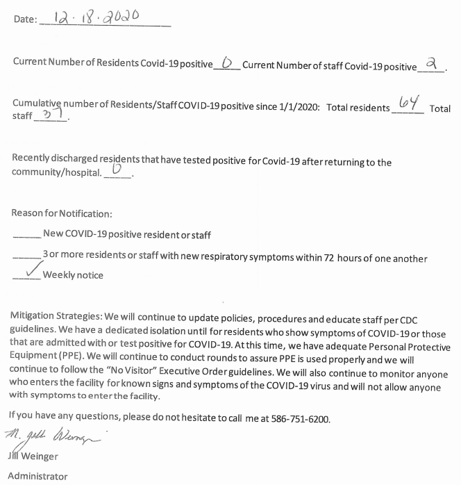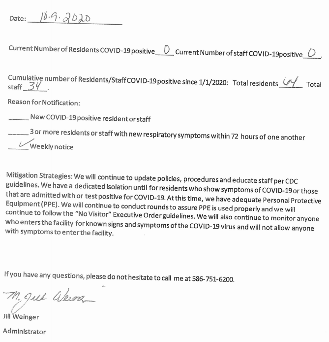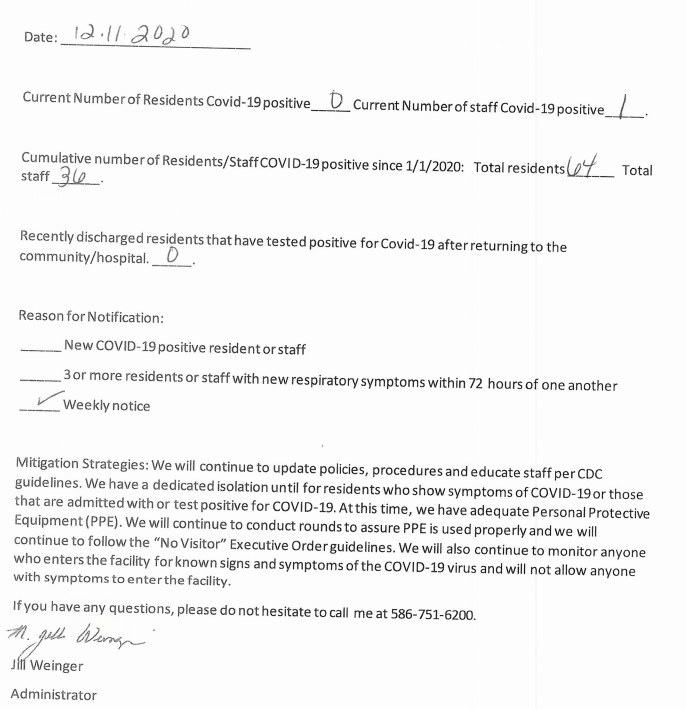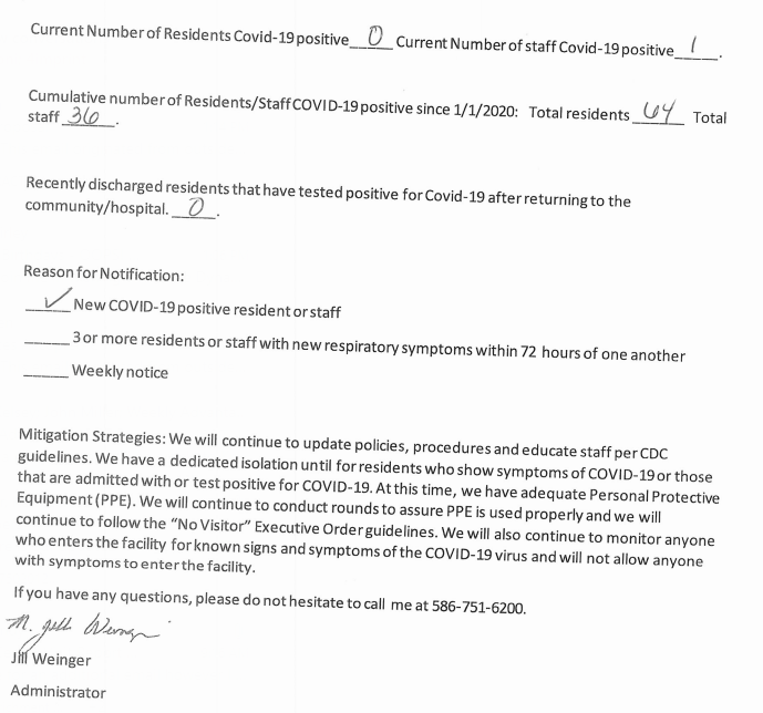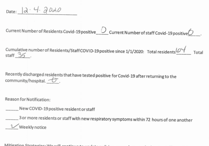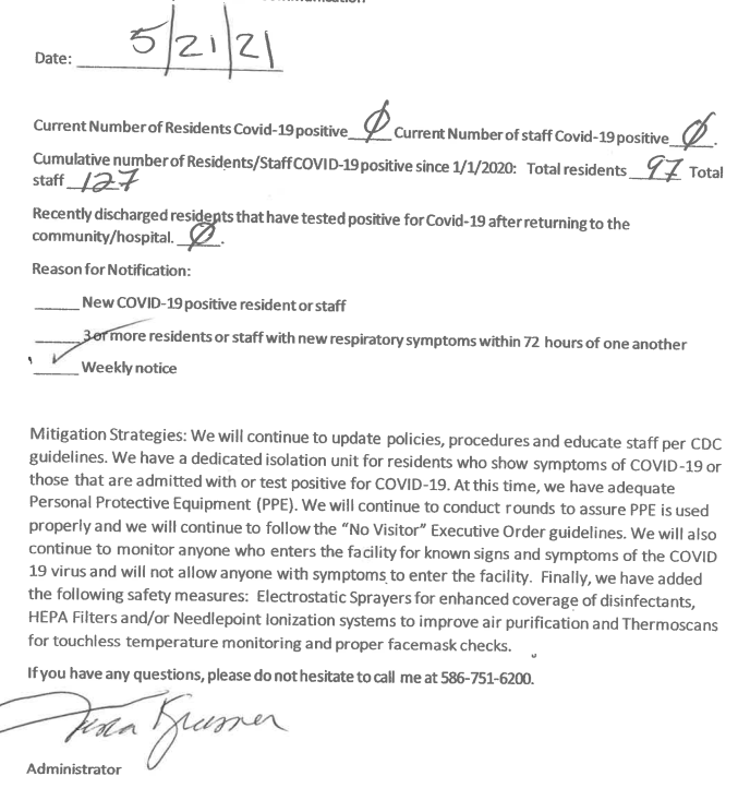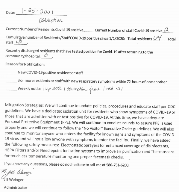 Mitigation strategies: We will continue to update policies, procedures and educate staff per CDC guidelines. We have a dedicated isolation unit for residents who show symptoms of COVID-19 or those that are admitted with or test positive for COVID-19. At this time, we have adequate Personal Protective Equipment (PPE). We will continue to conduct rounds to assure PPE is used properly and we will continue to follow the “No Visitor” Executive Order guidelines. We will also continue to monitor anyone who enters the facility for known signs and symptoms of the COVID 19 virus and will not allow anyone with symptoms to enter the facility.
