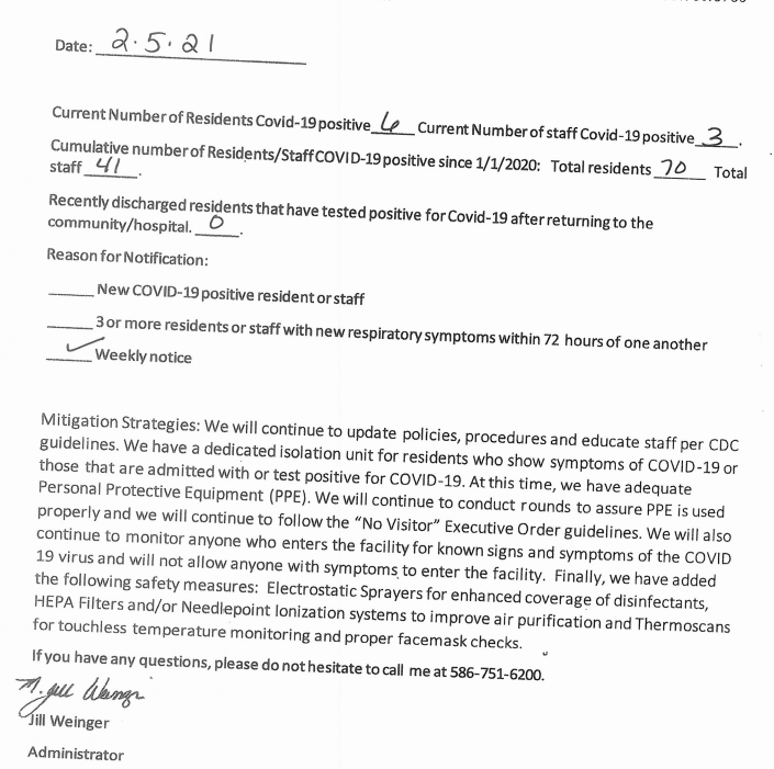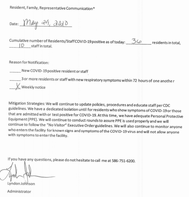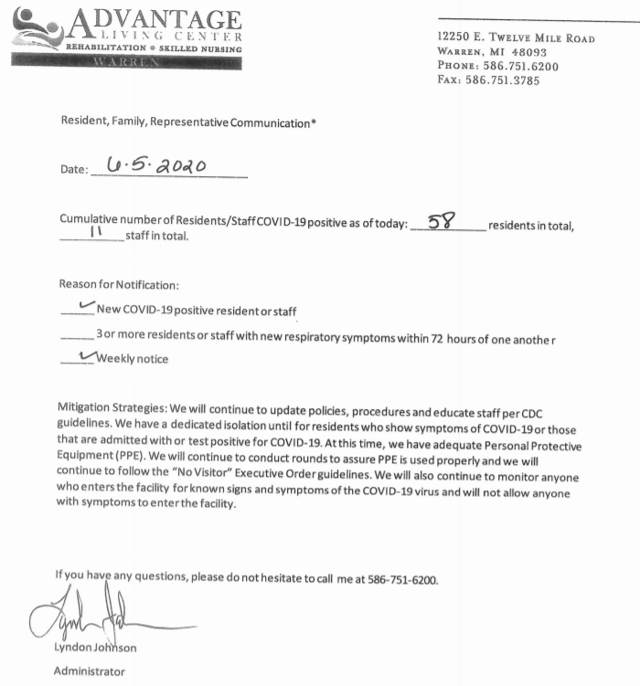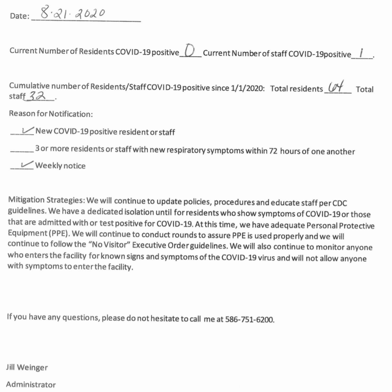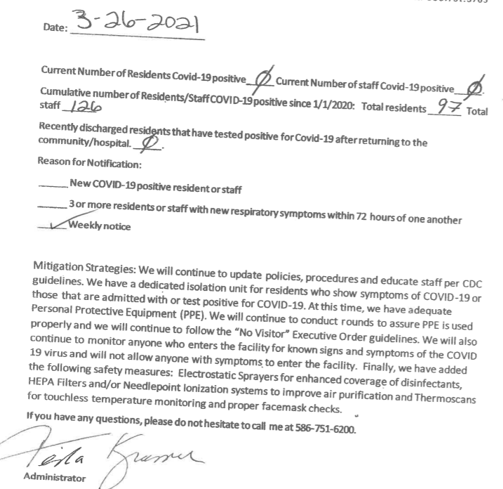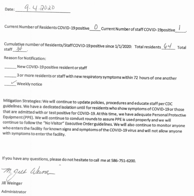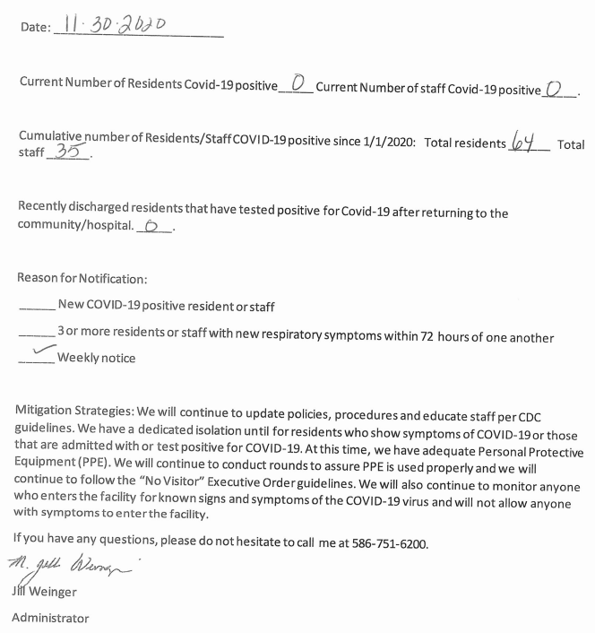 Mitigation strategies: We will continue to update policies, procedures and educate staff per CDC guidelines. We have a dedicated isolation unit for residents who show symptoms of COVID-19 or those that are admitted with or test positive for COVID-19. At this time, we have adequate Personal Protective Equipment (PPE). We will continue to conduct rounds to assure PPE is used properly and we will continue to follow the “No Visitor” Executive Order guidelines. We will also continue to monitor anyone who enters the facility for known signs and symptoms of the COVID 19 virus and will not allow anyone with symptoms to enter the facility.