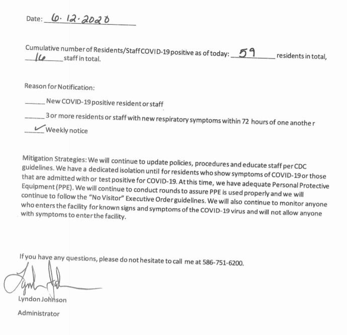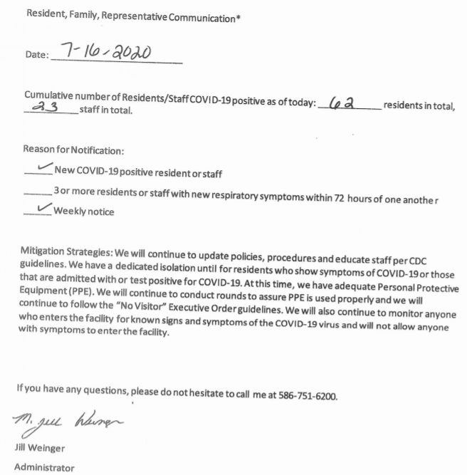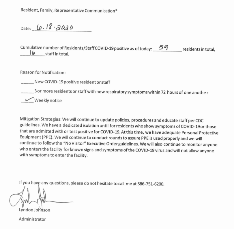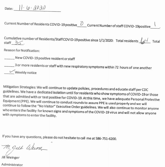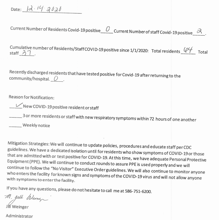 Cumulative # of Residents/Staff who are COVID + in house today: 2 staff member, 4 Resident