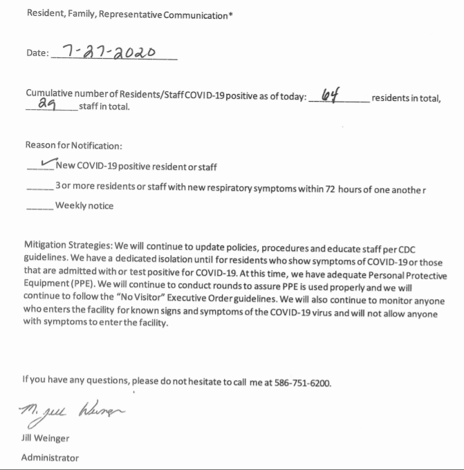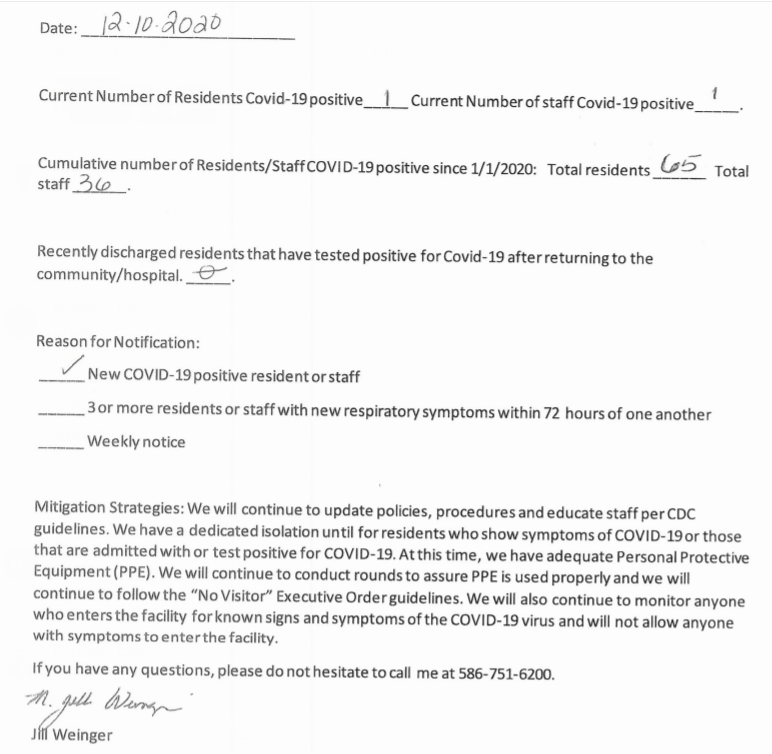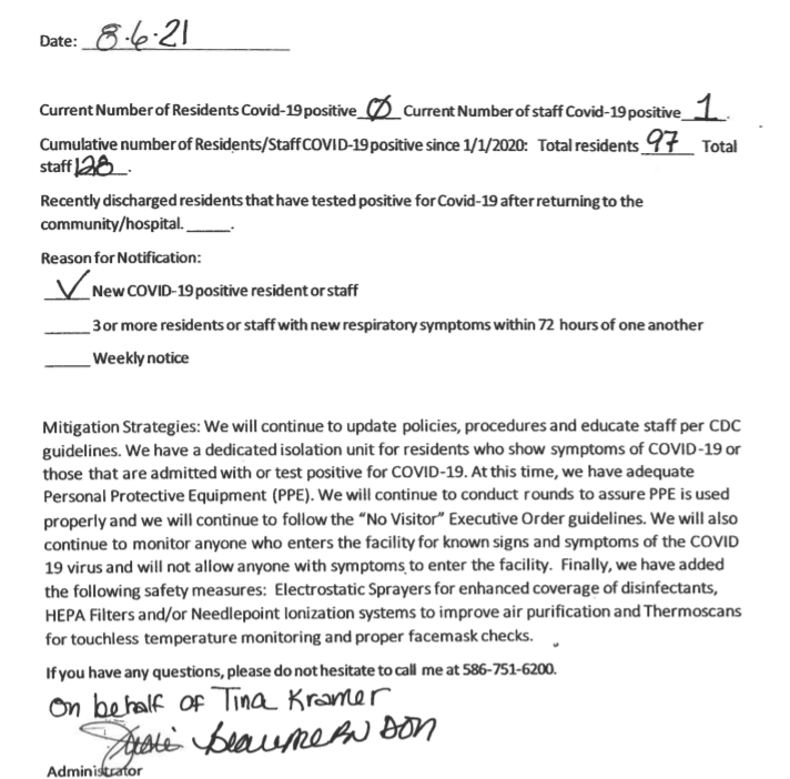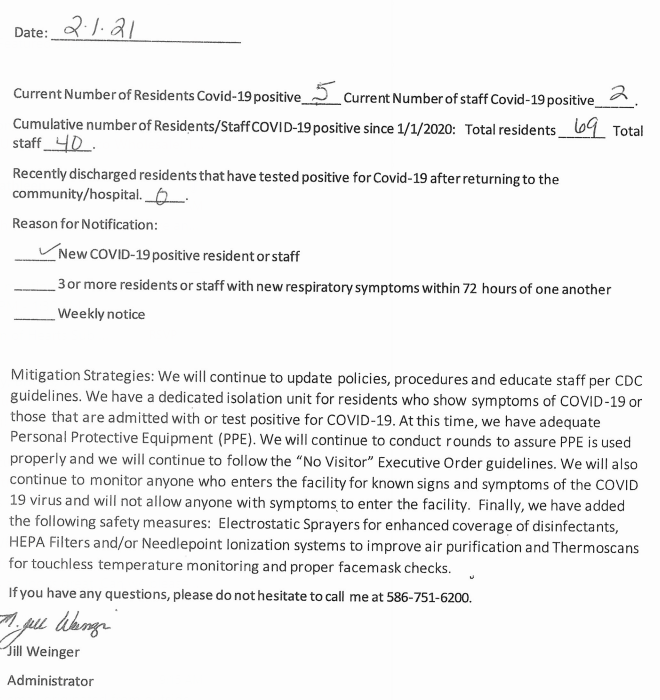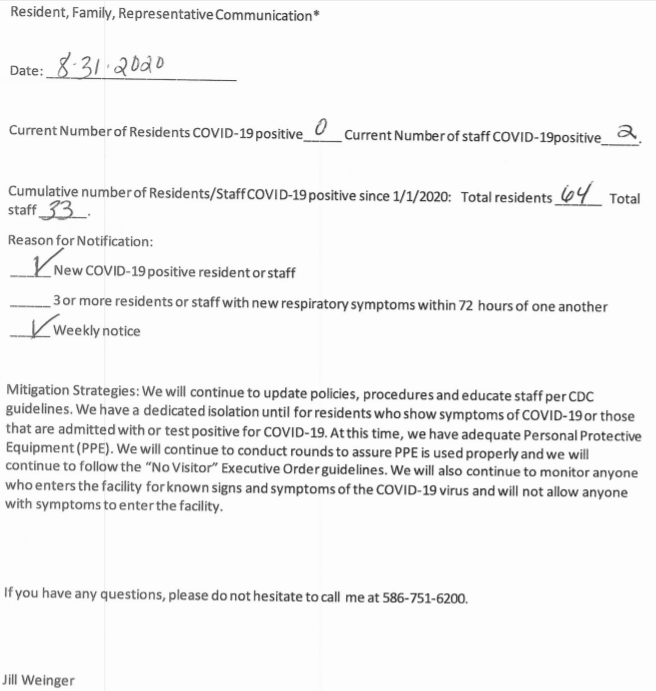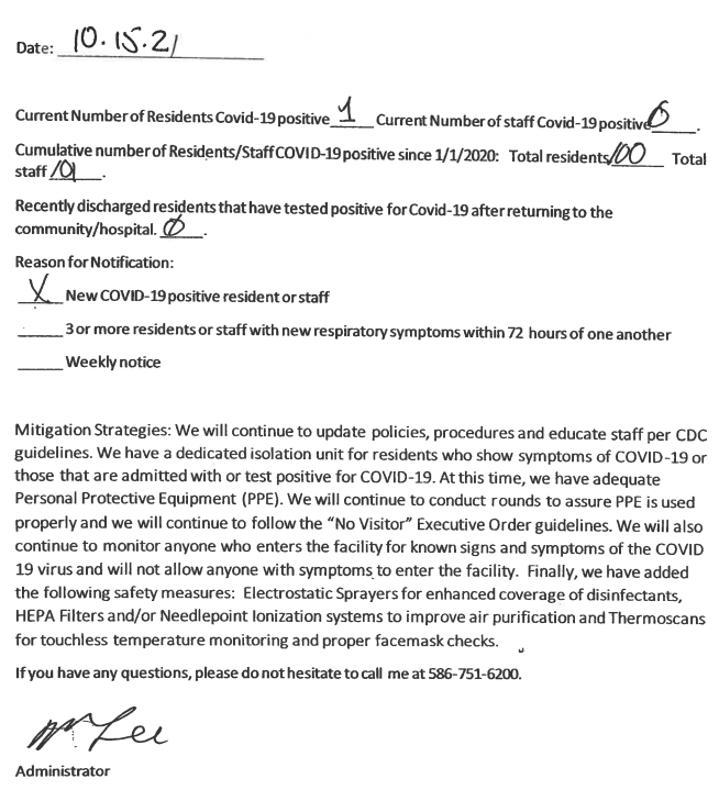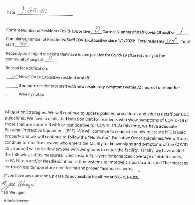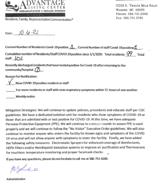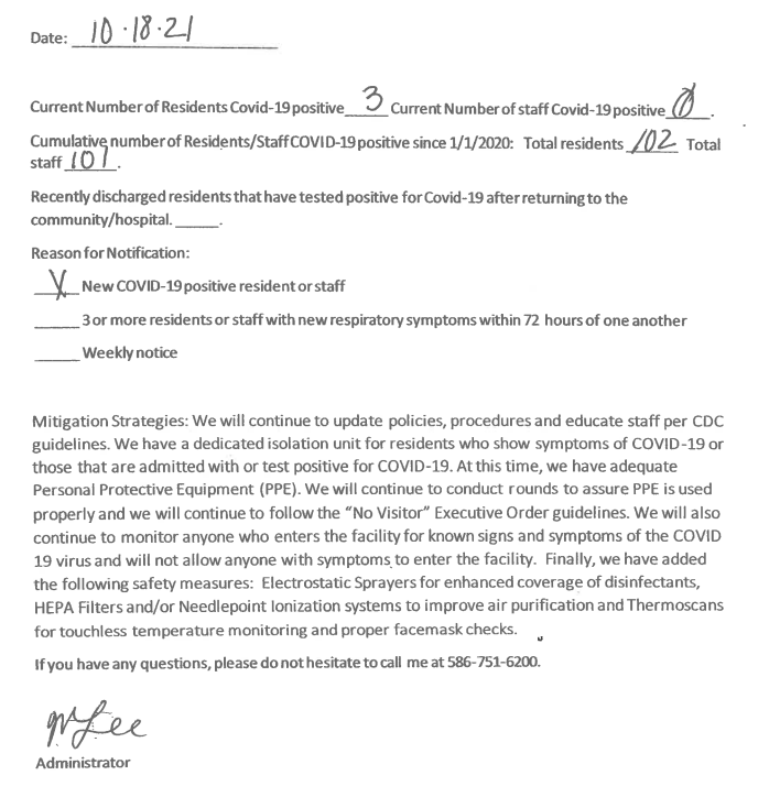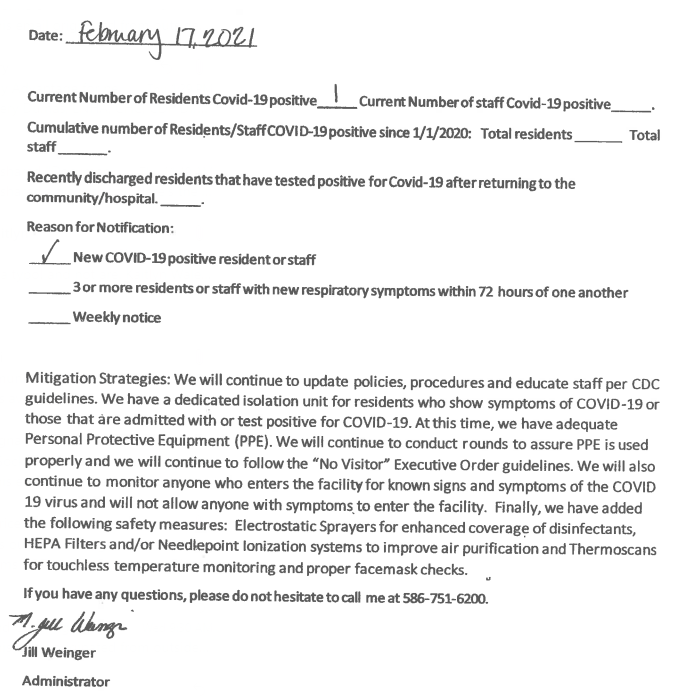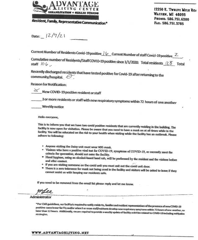 This is to inform you of a Covid-19 positive and the positive person may currently reside in the building. The facility is still open for visitation. Please be aware that you need to always have a mask on while in the facility. You will be educated on the risk to your health when visiting while the facility has an outbreak. Please adhere to the following: